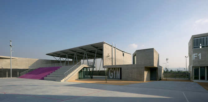 La idea de crear una construcción perimetral introvertida capaz de albergar un espacio interior complejo tiene mucho que ver con una actitud protectora, pero también se ve reforzada por las reducidas dimensiones de la parcela, lo que lleva al corazón del patio en forma de estrella a albergar la zona deportiva y a aprovechar parcialmente el de lo permitido, a la vez que crea una serie de espacios abiertos concatenados a diferentes alturas para contrarrestar las limitaciones de la parcela.