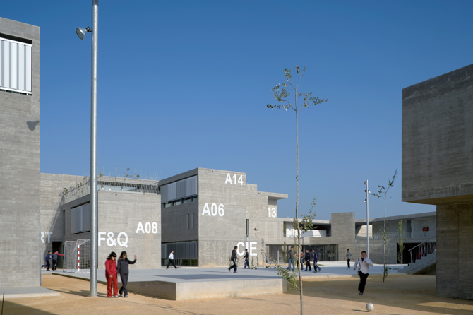Al pasear por esta ciudad fantasma, el IES Rafal se levanta como un barco que ha encallado en un desierto urbanizado, a la espera de la próxima marea... “Un conjunto de pequeños patios interconectados crea un complejo espacio de juego. Como al entrar en un recinto amurallado, el edificio parece permeable desde el interior y opaco desde su contexto urbano. El recorrido se convierte en infinito: patios sombreados, pasarelas cubiertas, terrazas a distintos niveles, pequeños rincones tranquilos una diversidad de sensaciones se suceden, multiplicando el espacio”.