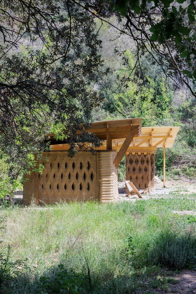 Finalmente, el 3D-Printed Earth Forest Campus, desarrollado por IAAC junto al programa 3dPA en el entorno del Parque Natural de Collserola, cerca de Barcelona, propone una arquitectura experimental basada en tierra local y materiales naturales. Este prototipo de unos 100 m² consta de una serie de espacios cerrados, cubiertos y abiertos, construidos con tierra impresa en 3D. El material es extraído a pocos metros del sitio, y luego se seca, tamiza y mezcla con agua, fibras orgánicas y enzimas naturales, recuperando técnicas vernáculas con tecnología avanzada, funcionando como un laboratorio vivo para probar nuevas soluciones constructivas y arquitectónicas.