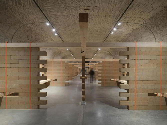 Por su parte, el proyecto Alfacs, de Bajet Giramé + JAAS, en Acanar, Tarragona, redefine un camping costero mediante una transformación gradual. La intervención parte construyendo terrazas escalonadas realizadas mediante tierra compactada, piedra sènia local y hormigones erosionados, generando una topografía artificial que sirve de base para los alojamientos ligeros temporales. A ello se suman muros de carga que se erigen mediante bloques prefabricados de tierra compactada, en un formato horizontal y aparejo que, en el detalle, explica su lógica tectónica.