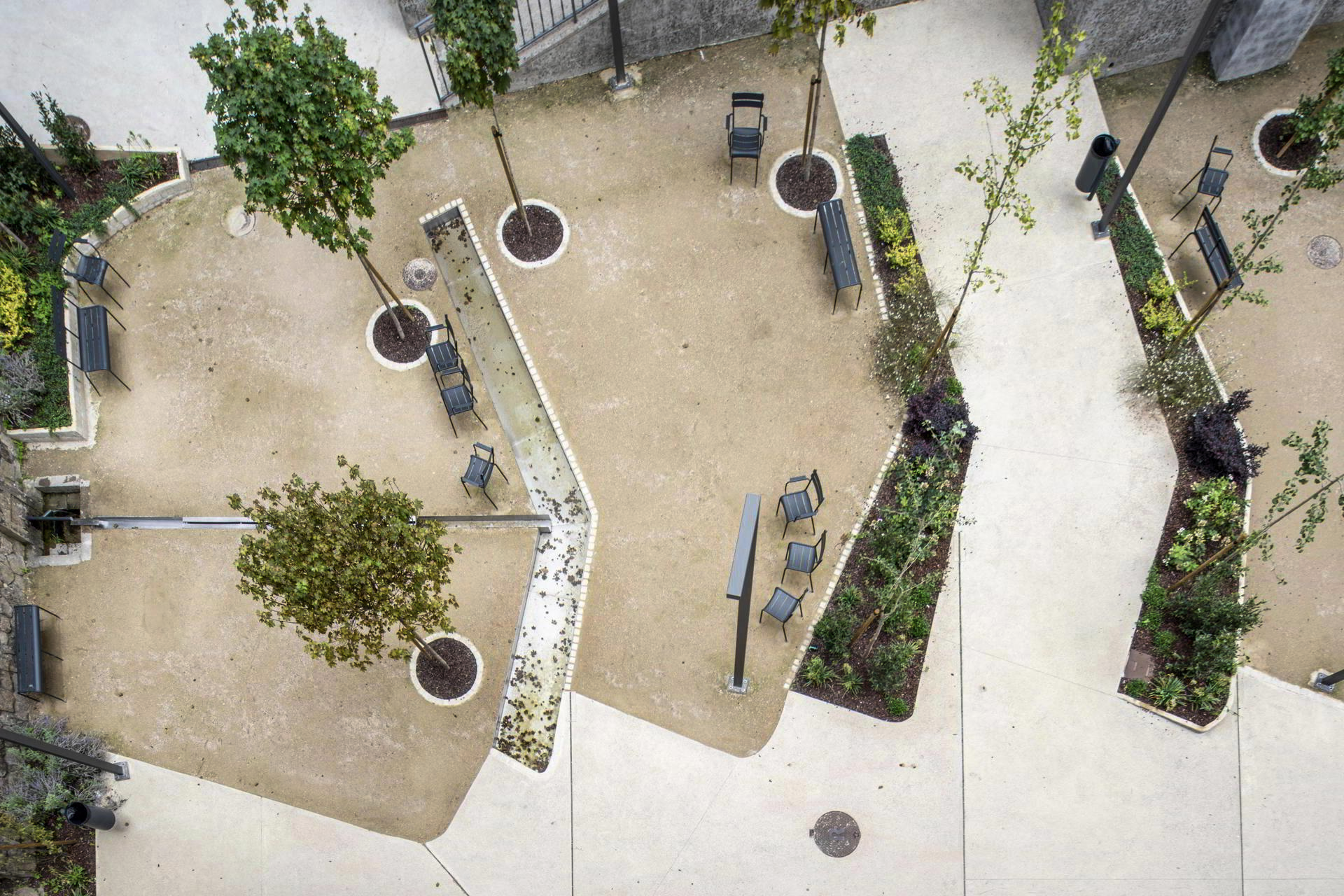 Por otro lado, A Picota, de María Fandiño Iglesias, recupera un espacio público degradado del casco histórico de Redondela, caracterizado por una topografía abrupta dominada por el asfalto. Para devolver condiciones de accesibilidad, permeabilidad y confort, la intervención redefine la microtopografía, gestiona las aguas pluviales mediante sistemas de drenaje e infiltración, y crea una nueva espacialidad concebida como un “patio de manzana” público y vegetado. Como materia de pavimentación y suelo activo, el proyecto opta por terrizo estabilizado, una tierra compactada semi-permeable, en lugar del habitual asfalto. Este suelo permite intercambio gaseoso en las raíces de la vegetación plantada, reduce emisiones, mejora la infiltración y contribuye al confort climático.