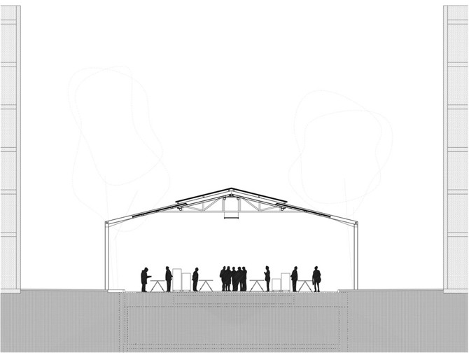 Se propone una cubierta ligera, soportada por pilares ubicados en las aceras laterales. Mientras la estructura de soporte es permanente, se proyectan unas cubiertas retráctiles que pueden recogerse los días laborales y los domingos por la mañana para dar mayor cobertura al mercado dominical.
