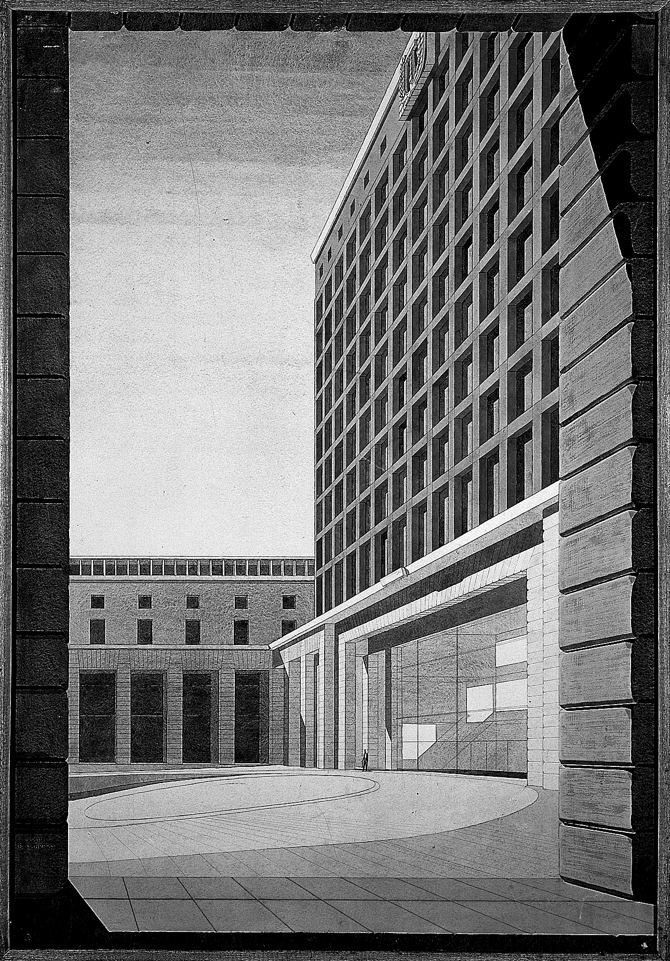 Todo el edificio está articulado en torno al cuerpo central. Tiene cuatro fachadas diferentes, pero con una misma organización. La potente simetría de la retícula de las fachadas principal y laterales contrasta con el juego de volúmenes y formas de los vanos en la trasera. La fachada delantera tiene dos cuerpos laterales bajos con siete plantas construidos en granito y el cuerpo central reticular de ladrillo con 16 pisos, precedido por el amplio pórtico también de granito».