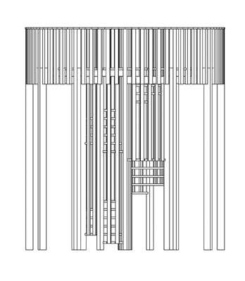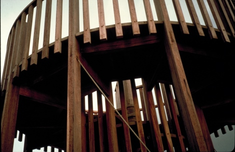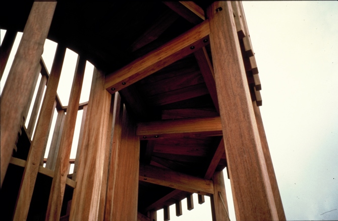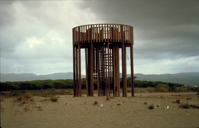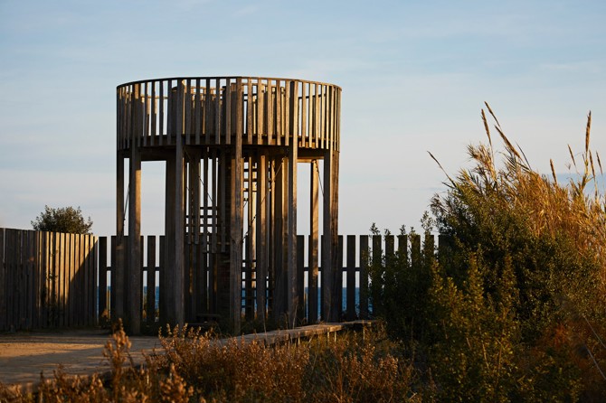 La torre mirador de las zonas húmedas del Delta del Llobregat se diseñó en el año 1993 para conseguir esta visión. Se trata de una torre circular alrededor de una escalera de caracol, que con una estructura de pórticos radiales sostiene un balcón circular junto a la escalera a 3,20 m de altura. Está construida con madera de bolondo para asegurar su estabilidad, durabilidad y bajo mantenimiento, en un clima tan corrosivo como el marino.