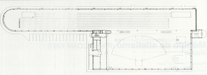 Constituido por dos pastillas prismáticas escalonadas, el cuerpo más alto y ancho es también el más corto, pero el de más voluminosa presencia, mientras el inferior tiene un desarrollo muy alargado y cubre las pistas o calles longitudinales de entrenamiento, terminando su trazado en cilíndrica masa, a modo de ábside, de forma que tal conjunción introduce un elemento dinámico en la serenidad del conjunto. En el interior, la cubierta sobre estructura metálica tridimensional, los paramentos de ladrillo visto, las pasarelas entre ambos bloques, especialmente la central, el refinado diseño de los elementos industriales y la luminosidad captada a través de los amplios paños abiertos al frente este, aportan una espacialidad muy notable al resultado final.