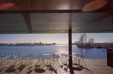 Se construye primero con grandes masas de hormigón y piedra, con movimientos de tierras, con fondeos submarinos. Se construye después en seco, como si de un barco se tratara, con madera y metal, ensamblando, encajando, atornillando. Se propone un muelle asimétrico que mira en una dirección concreta y permite que las embarcaciones no obstruyan con su presencia las vistas desde la edificación.