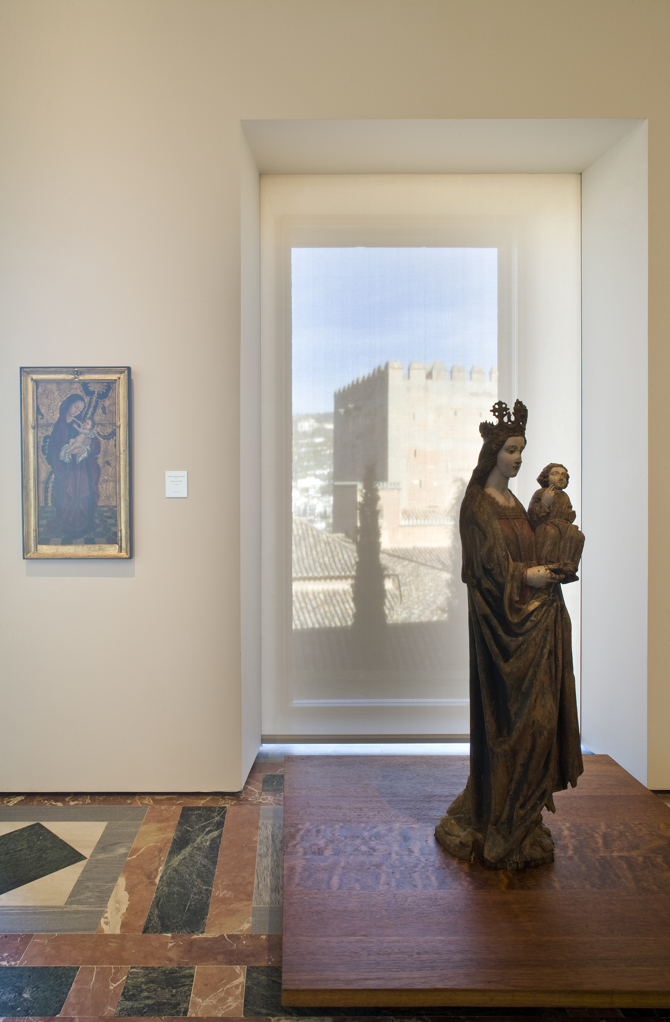 Además, esta estructura basada en un sistema de largueros telescópicos cumple dos funciones esenciales. La primera, acoger en su interior las instalaciones necesarias. La segunda, organizar y jerarquizar dos escalas: la expositiva y la arquitectónica. Gracias a esta doble jerarquía, la parte superior de los paramentos actúa como caja de resonancia de luz, que añade una iluminación difusa general a la iluminación natural. Así se consiguen adaptar las condiciones espaciales existentes a nuevos usos sin comprometer los valores arquitectónicos del edificio y exhibir el devenir histórico de su fábrica: de palacio a museo.