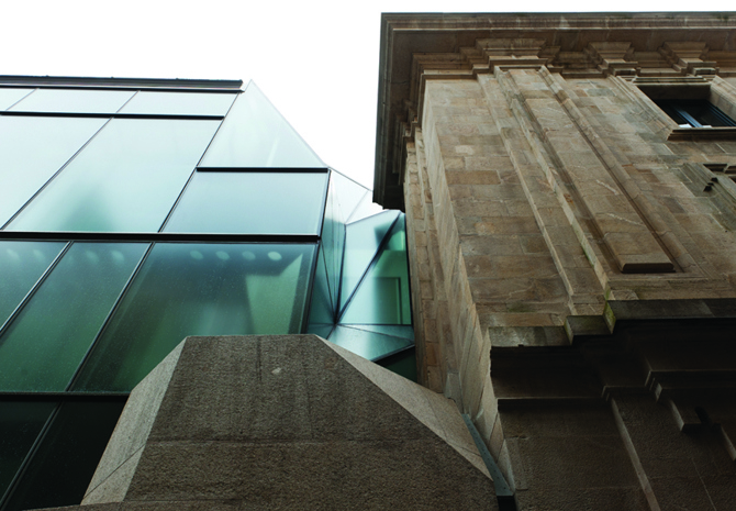 Conseguimos la transformación del edificio con pocos recursos. El nuevo uso crea un espacio abierto a la ciudad. Se respeta el edificio existente, ampliando solo un espacio que surge con una nueva fachada de vidrio y piedra. En el interior se crea un gran espacio flexible sin obstáculos y con una luz variable y controlada donde es fácil orientarse.