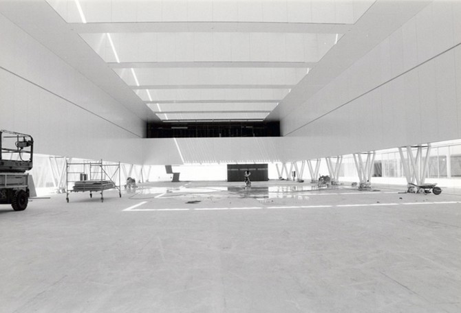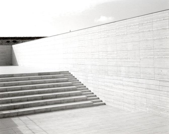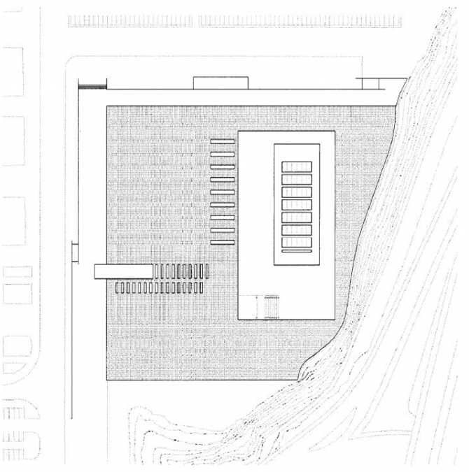El incesante estruendo del tráfico en esa tierra de nadie exigía una construcción digna, propia también de la inserción de un programa único en un contexto fundamentalmente académico. La lámina de agua que tapiza el solar se ve interrumpida por un gran vacío para albergar una austera caja de madera. Al igual que las antiguas fortalezas o los templos orientales, el edificio crea un reino propio, que parece remoto e inaccesible desde el campus. La piscina que caracteriza el lugar se concibe como una aproximación escenográfica al museo. Un eje principal del campus se prolonga en forma de escalera suspendida, que desaparece al hundirse en un patio. Aquí, el prisma, que solo se intuye de lejos, se revela en su totalidad. El patio articula las diferentes piezas en las que se distribuye el programa. Dispuestas a lo largo de su perímetro, debajo del estanque, hay salas multiusos iluminadas por una sucesión de tragaluces que parecen flotar en la superficie líquida de arriba.