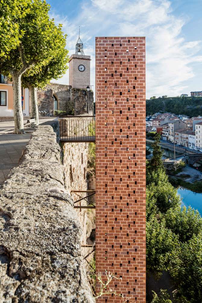 Se utilizan materiales que dialogan con las preexistencias del lugar, potenciando la relación de las industrias textiles y reconociendo el estrado vegetal como espacio público. La caja del ascensor se resuelve mediante tres materiales. El acero en la estructura, construida en un taller local; la cerámica en los tramos superiores colocada como una celosía de ladrillo de canto que aporta porosidad al proyecto, y el cerramiento de vidrio en el tramo inferior que permite una relación visual con el espacio público del río.
