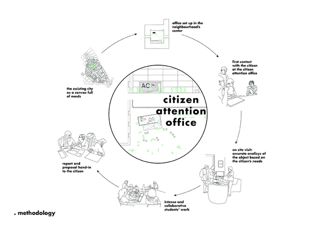 La metodología de AC pretende ser exportable a otras universidades y administraciones como herramienta de código abierto. Para poner en práctica la metodología AC se realizan dos acciones: la puesta en marcha de la Oficina de Atención al Ciudadano, a pie de calle. Y la toma de contacto con las entidades y asociaciones que ya trabajan en el barrio. Estas dos acciones nos permiten ser visibles y comprometer los casos de estudio.