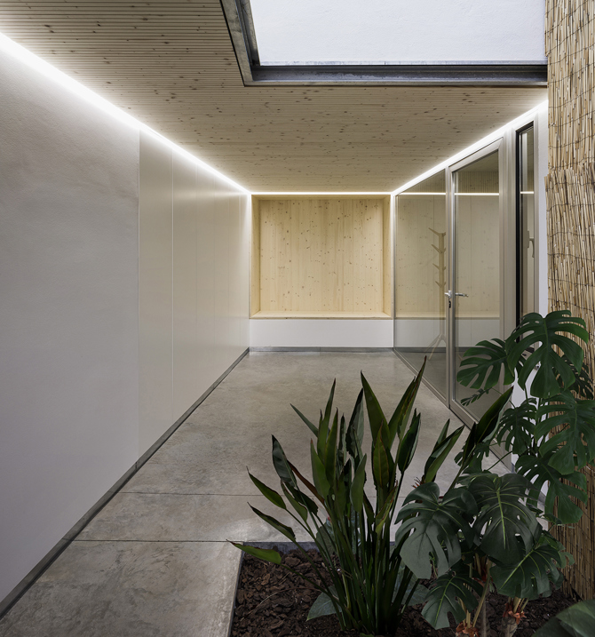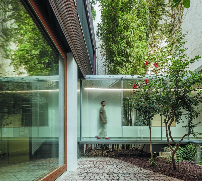 En este contexto, proyectamos la ampliación de unas oficinas situadas en una vivienda de tres plantas. Pensamos que la incorporación de tres nuevos locales, dos en planta baja y uno en la planta superior, debía suceder sin que apenas percibiésemos el tránsito entre un ámbito y otro, definiendo un espacio continuo que desde las oficinas originales serpentease por el interior de la manzana atravesando patios, internándose en la densidad edificada y ahuecándose cuando fuese preciso hasta alcanzar la cubierta.