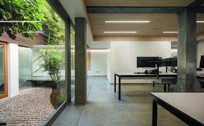 Para subrayar esta condición continua del espacio optamos porque pavimento, techo y revestimiento exterior se prolongasen a lo largo de la intervención. Un suelo de hormigón fratasado, elevado y calefactado atraviesa espacios interiores y exteriores y, cuando el volumen del nuevo espacio sale al exterior para encontrarse con la oficina original en sus diversas cotas, se reviste de planchas de acero galvanizado y se dispone sin apoyos, subrayando así su condición de artefacto autónomo entre los vacíos existentes. Las piezas de mobiliario, los ámbitos de techo acústico y las ventilaciones cruzadas a partir de los patios acotan sin divisiones los lugares de trabajo, y matizan la diafanidad de la planta.