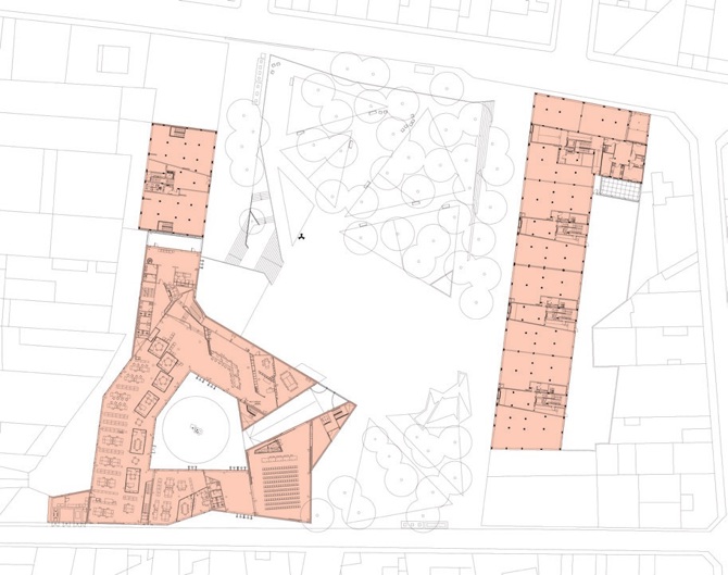 Su aspecto general, desde sus gestos en planta para que fuera visto desde las dos calles principales que penetraban en los tejidos colindantes hasta el tratamiento de su volumetría troceada en unas zonas o tratada con más énfasis en otras, nació de la voluntad de dar la máxima continuidad a los dos tejidos y de presidir y dar sentido a la plaza.