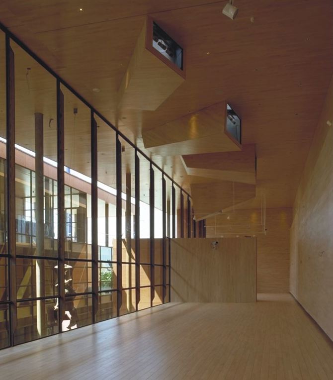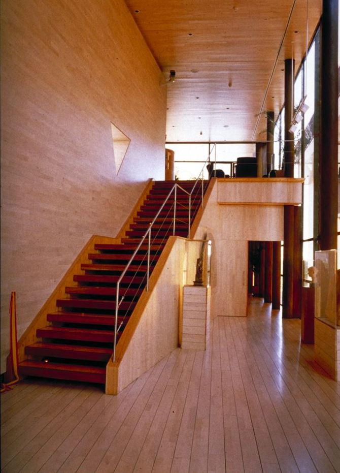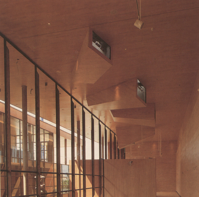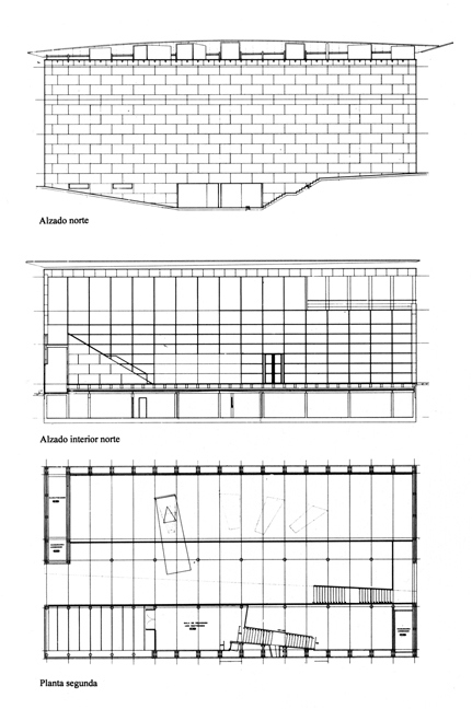 La construcción en madera hace al pabellón desmontable, subrayando además el carácter metafórico del edificio. La imagen es abstracta. La materia conserva la condición natural y la estereotomía nos refiere a otros materiales. El desdoblamiento en paredes, suelos y techos permite ocultar las instalaciones y el acondicionamiento. Una sobrecubierta que protege el cuerpo principal y permite el desarrollo de los lucernarios.