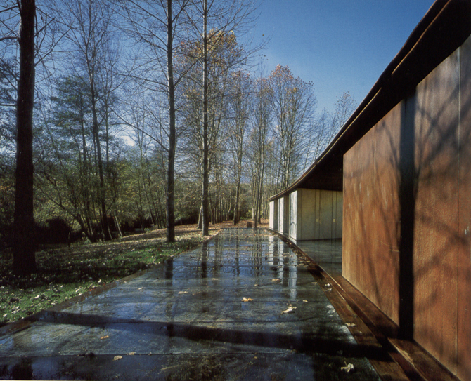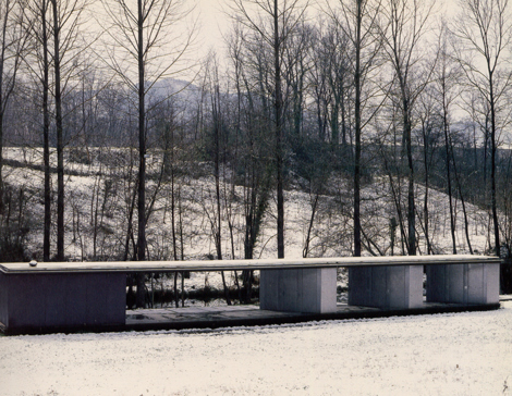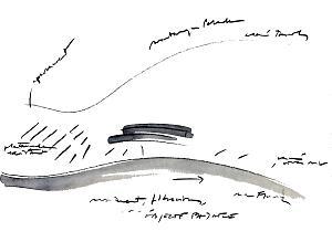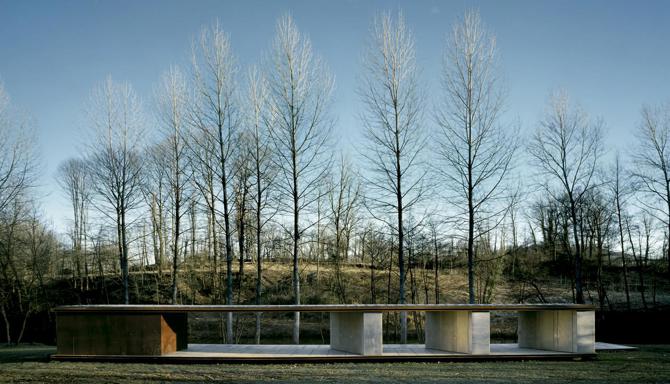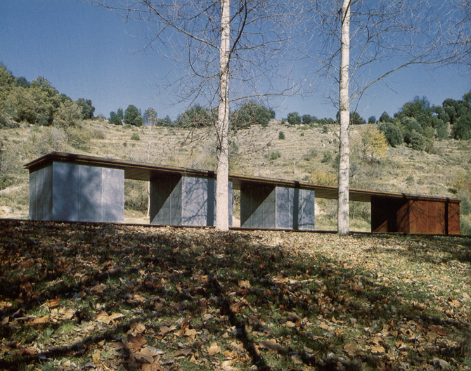 El río fluye, la ribera lo acompaña y los arroyos desembocan. Fluir desde el platanar, acompañar desde la ribera, y desembocar desde la ladera, son los motivos que deciden la voluntad de ser del pabellón.
