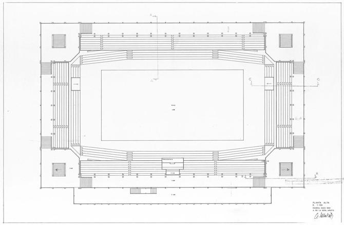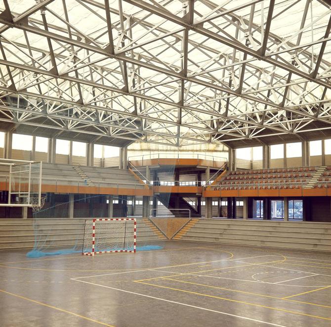 En la planta rectangular se observan gradas en los costados de las pistas, además de cuatro torres bajas con accesos verticales y aseos en las cuatro esquinas del edificio. La estructura es de hormigón, los forjados y las gradas de hormigón pretensado, y el cerramiento de planchas de hormigón pretensado, acabado de canto rodado. La cubierta se realiza de plástico traslúcido con manta de fibra de vidrio y láminas de poliuretano sobre la estructura metálica, con el fin de conseguir unas buenas condiciones de aislamiento acústico y térmico.