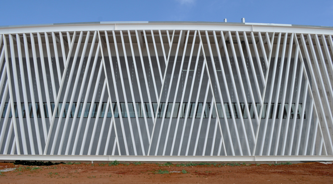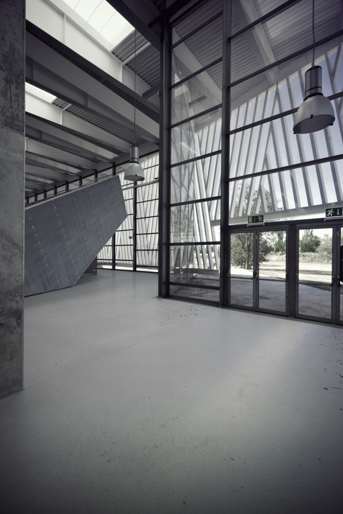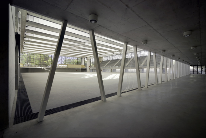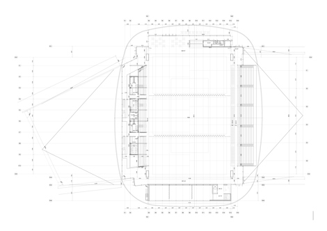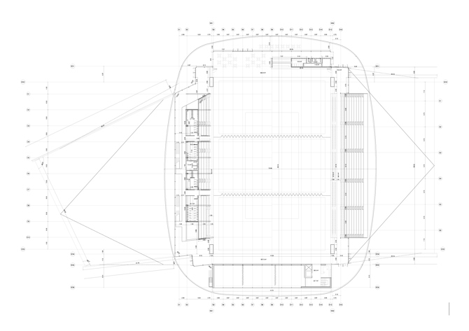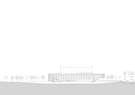 Pero el pabellón también se integra en un contexto más inmediato. Concebido como una forma blanda y sin aristas, su perímetro curvo aspira a naturalizar la relación con el entorno, evitando la imposición de un orden jerárquico en las fachadas y fomentando el carácter paisajístico del conjunto. La cubierta, caracterizada como una sombra, confunde la jerarquía y el tamaño de sus miembros, transformando su percepción, fomentando la levedad de lo que flota, de lo que se traba como una textura, escondiendo la repetición en la alternancia de llenos y vacíos, de sombra y luz. Para ello es fundamental la función estructural de la fachada. Configurada igualmente como un textil, ligero y permeable, pero de dimensiones importantes, esta se cuelga del borde de la cubierta para fomentar su levedad pero también para contrarrestar la luz de las vigas como un contrapeso, equilibrando los momentos flectores, estirando de los voladizos y adelgazando cuantitativamente la estructura principal de modo considerable.