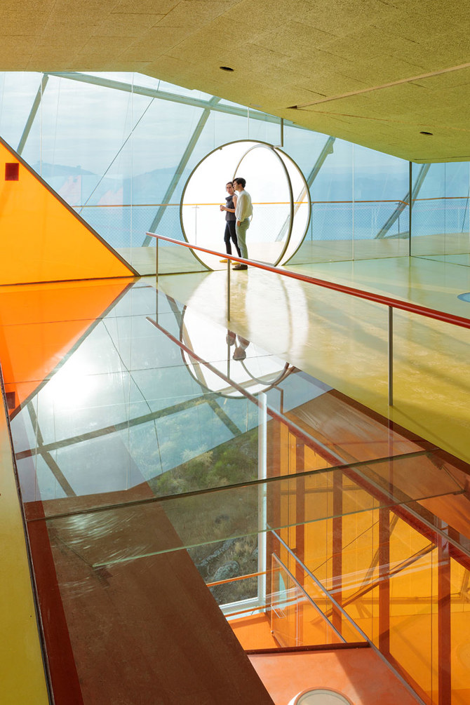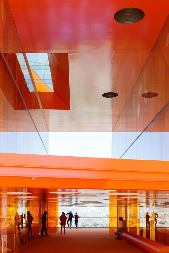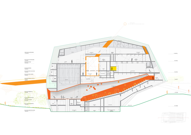 Dime si su aspecto final desencadena en ti el mismo recordatorio que el de G. Sand para Flaubert: “No definas la forma, no te molestes”. La forma del nuestro se debe a la sección del edificio; debido, como hemos dicho, a la idea de apoyar la parte más pequeña posible en el suelo, que corresponde a la zona del escenario y a las gradas de la sala principal. La sección de esta sala es la que sigue definiendo y completando la forma, al superponer el resto del escrito sobre ella: el vestíbulo de entrada, la sala secundaria para 300 personas, que puede dividirse en tres para 100 espectadores cada una, las salas de exposiciones y la zona de restauración. La entrada se encuentra en el nivel de la calle urbanizada, a más de 17 m por encima de la parte más baja del edificio, mediante una pasarela naranja que llega a un cañón vertical de 12 m de profundidad del mismo color, donde se acentúan las vistas del campo, las estribaciones de la sierra de Gata. Desde aquí es posible desplazarse por todo el casco central de hormigón, subir o bajar por un conjunto de rampas y escaleras de caracol que mezclan los espacios exteriores e interiores. Esto obedece a dos razones: la economía y el gasto. Economía por no climatizar ni utilizar cristales para encerrar ciertas partes. Gasto por el cruce de espacios –de dentro a fuera– a causa de la mezcla de sus climas.