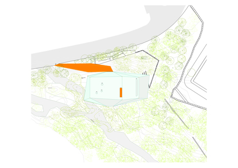 Al habernos decantado por la segunda opción, nos vimos obligados a apoyar los edificios en un nivel mucho más bajo que la calle, debido a la considerable diferencia de altura entre ambos mundos. El mundo artificial había creado un terraplén de 17 m de altura que cubría los contornos naturales, ahora enterrados debajo. Como reacción a esta imparable sumisión (sous les paves, les 17 metres de paves, la plage), decidimos que nuestra solución respetaría al máximo el terreno, apoyándose y cubriendo la menor superficie posible de la parcela.