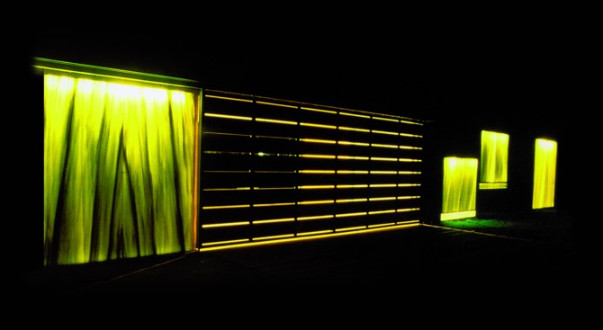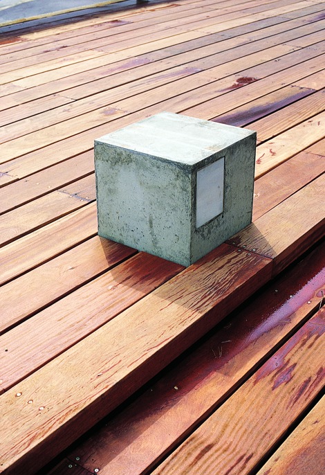 Dentro de la ordenación lineal que rige la organización general del espacio, se disponen dos objetos arquitectónicos, como prismas construidos con hormigón. El primero, el edificio de la sede social y el bar, quedará dispuesto horizontalmente bajo las copas de los árboles; el segundo, la torre de iluminación, se destacará como hito vertical elevándose sobre aquellos; mientras aquel opera como límite visual dispuesto bajo la masa del arbolado, la torre vertical adoptará el papel de tótem identificativo que preside un claro del bosque. Por la noche, todos los elementos de hormigón iluminan el parque. La torre se transforma en una gran pantalla de luz; por su parte, la pequeña edificación muestra una imagen diferente desde la sorprendente transparencia de sus ventanas de mármol de Macael.