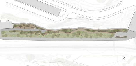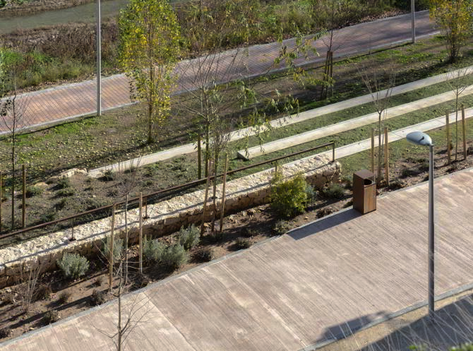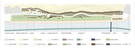 El muro de mampuestos que constituía el cerramiento de una antigua industria demolida, actúa de contención entre la plataforma elevada y la zona inferior inundable, incorporándose al diseño dejando patente su preexistencia, y sirviendo de guía para ampliar su trazado con la misma tradición constructiva de los muros de abancalamiento. Así, la mampostería conforma un mirador de trazado poligonal, encajonando la plataforma superior como una atalaya. Se extiende esta misma solución como fondo escénico y elemento de protección de las cuevas excavadas en la ladera, actuando de barrera de protección frente al desprendimiento de derrubios del talud posterior y permitiendo su mantenimiento. La plataforma elevada, menos expuesta a las inundaciones, tiene carácter de parque urbano al concentrar mayor variedad de equipamiento y de especies vegetales de carácter autóctono que actúan como núcleo de dispersión y reclamo. Este espacio, acotado visualmente, invita al juego libre y al uso recreativo familiar. Taludes vegetalizados, rocallas, plataformas en gradería y una escalera de enlace con el sendero, engarzan ambos niveles de la intervención diluyendo su transición. Pavimentos permeables, bancos poligonales que acotan alcorques, vegetación que protege desniveles evitando barandales, piedra que amuralla, intencionada sobriedad de materiales y elementos compositivos, cediendo el protagonismo a la vegetación y a la recuperación del espacio natural.