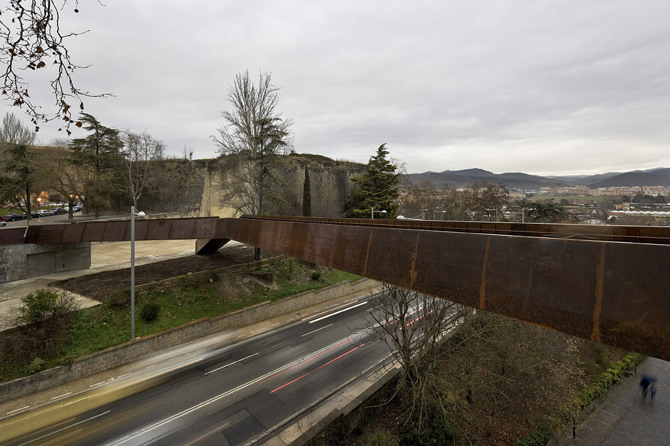 La construcción de la pasarela peatonal entre el Baluarte de Labrit y el Fuerte de San Bartolomé responde, a lo largo de los años, a una inquietud de los urbanistas de Pamplona de dar continuidad peatonal al paseo que recorre el borde del recinto amurallado más allá de los límites de los viejos burgos. El peso histórico del lugar aconsejaba acometer una propuesta más ambiciosa que la propia resolución de la accesibilidad.