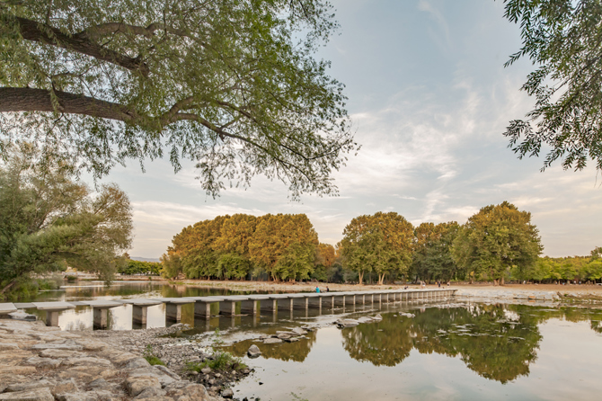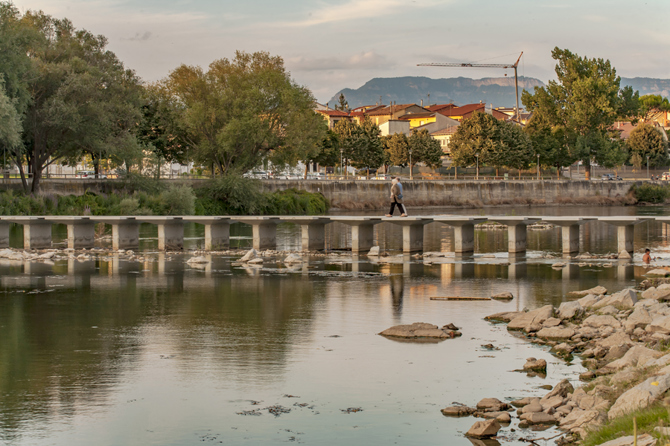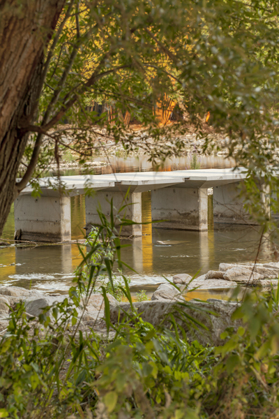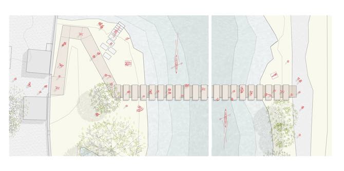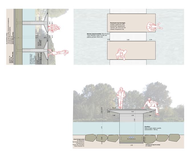 Se opta por un “passallís”: una infraestructura inundable que se incorpora de manera natural a las dinámicas del río. Se plantean una serie de plataformas que evocan a los antiguos pasos piedra a piedra. La geometría responde a las necesidades propias del ámbito fluvial: no hay formalismo sino una respuesta eficiente a las demandas hidráulicas y funcionales.