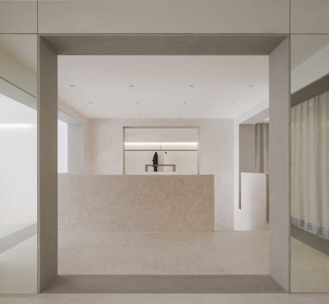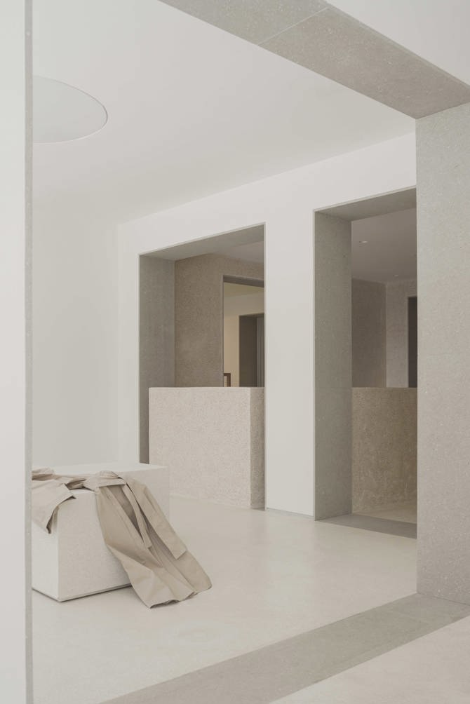 Unas contundentes piezas de microterrazo neutro y volumen puro ordenan el espacio y permiten realzar los productos allí expuestos. Por su parte, los pasos entre salas quedan enmarcados por medio de un revestimiento de piedra local valenciana, un gesto que enfatiza la contundencia geométrica de las transiciones y acentúa su profundidad.