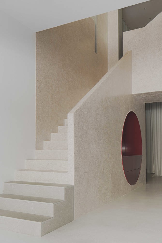 De entre las nueve salas, es el espacio central el que adopta una identidad característica. Manifiesta su singularidad a través del color y actúa como nexo; por un lado, conecta verticalmente las dos plantas y, por otro, ordena y articula los ochos espacios perimetrales. En su interior, una imponente escalera concebida como una escultura de microterrazo rojo, se convierte en el elemento central del proyecto. Si bien el empleo de la geometría caracteriza este espacio, también se traslada al resto de salas.