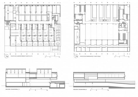 Las plantas de alimentos y producción de formas farmacéuticas plantean procesos de desarrollo paralelos. En este sentido, el desarrollo del proyecto ha consistido en detectar las zonas comunes para aunarlas, ordenar las circulaciones para unificarlas y estructurar el programa funcional en tres niveles de un solo edificio.