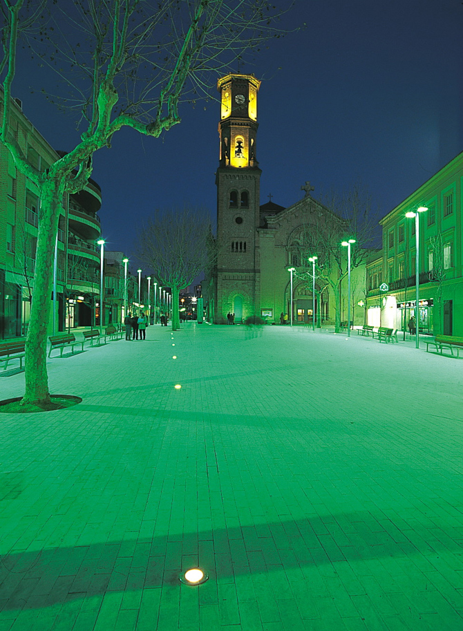 Las líneas de alumbrado también se han simplificado al máximo e igualmente relacionan la calle con la plaza y, a su vez, la iglesia con el Ayuntamiento. En concreto, se han dispuesto dos hileras de columnas de 7 m de altura empotradas en el suelo y que van de un extremo al otro de la plaza. Finalmente, tanto la fachada del Ayuntamiento como la de la iglesia disponen de iluminación propia. Uno de los elementos extraordinarios dentro de este conjunto es la escultura de Jaume Plensa, situada frente a la casa consistorial.