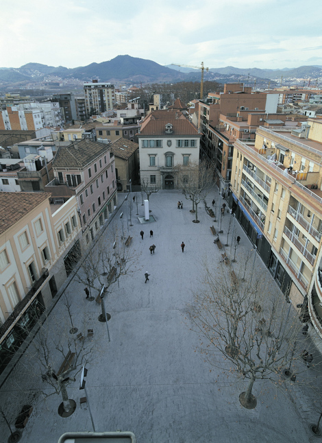 El nuevo pavimento presenta una ligera curvatura que le permite actuar como gran alfombra que envuelve y unifica los distintos niveles del terreno. La plaza está recubierta de piezas prefabricadas de hormigón de pequeño formato, tipo losa romana lisa. Las líneas de cambio de pendiente y dirección del pavimento, correspondientes a la alineación de la fachada del ayuntamiento, quedan señaladas. El acceso a la iglesia ha querido distinguirse mediante una pavimentación diferente a la del resto, totalmente plana, con piezas de hormigón de gran formato e idéntica a la del pasaje Penedès, que nace a continuación del edificio religioso.