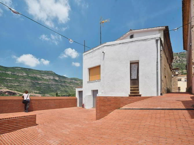 La propuesta busca recuperar el casco antiguo para el ciudadano, estableciendo un diálogo respetuoso y sensible con el paisaje que lo rodea. El núcleo histórico, articulado en torno a la iglesia de Sant Vicenç y el cementerio —ambos del siglo XI—, se pavimenta con ladrillo macizo de tonalidad rojiza, evocando las tierras que tiñen los riscos circundantes. Esta elección no solo integra visualmente la actuación en el paisaje natural, sino que genera un conjunto unitario en torno a la iglesia. Se plantea una plataforma única que favorece la accesibilidad universal y devuelve el protagonismo al peatón, mientras que una iluminación colgada, inspirada en las verbenas populares, remite al pasado veraniego del pueblo.