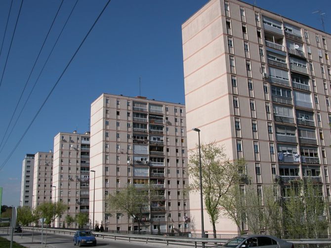 La ordenación general se basa en supermanzanas, dotadas de amplios espacios libres, sobre las que se disponen formaciones paralelas de bloques abiertos con doble crujía, según diversos tipos (de 5, 6, 6, 7 plantas) preferentemente orientados en perpendicular al viario. En los bordes norte, frente a la Dehesa Boyal, y oeste, junto a la avenida de Andalucía, se alzan dos clases torres (de 12 y 14 plantas), que en el segundo caso constituyen, además de la imagen más representativa del barrio, una notable muestra de racionalismo popular madrileño.
