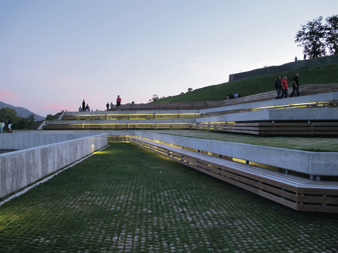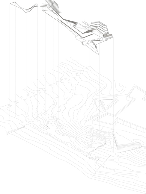 Se propone aprovechar la orografía existente para acoger en forma de zócalo los diferentes espacios cotenedores de un futuro núcleo de baños, puesto de socorrista, centro de interpretación. Y resolver la accesibilidad de toda la ladera con el único gesto de un muro de contención continuo que, sin escala urbana conocida, a veces es banco, otras peto, graderío, peldaño, bordillo o plataforma. La prolongación de la geometría defensiva del foso organiza el conjunto a la vez que resuelve un nuevo acceso desde el pueblo mas cercano. La cantera mas grande restituida ofrece un gran espacio en sombra que alrededor de un bosque de pilares acoge, a la vez que oculta, una nueva cafetería.