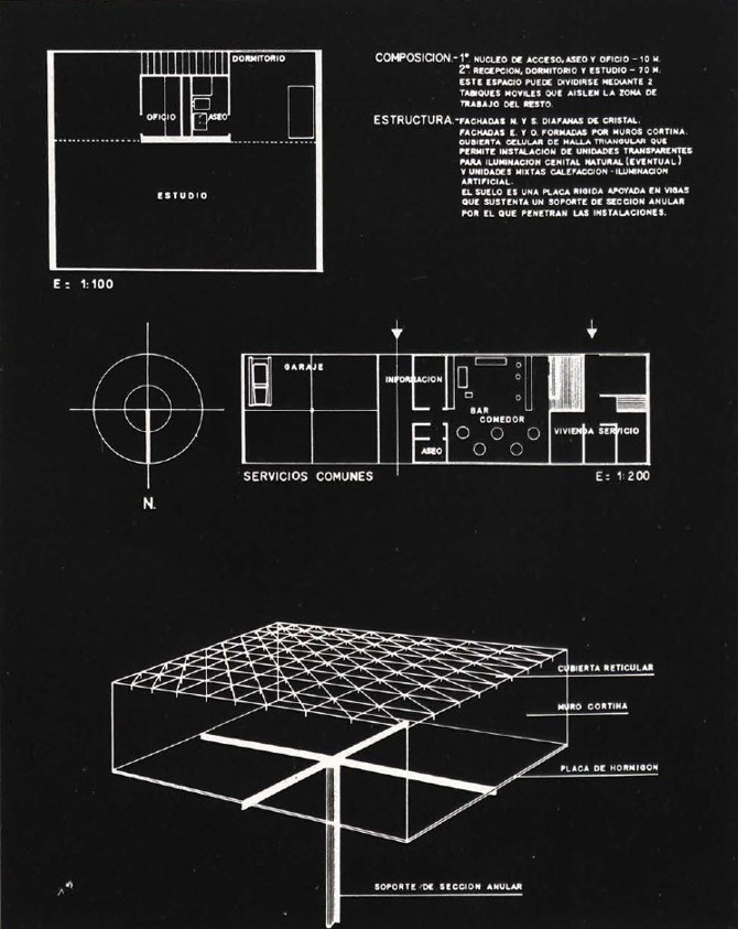 El terreno elegido es una de las numerosas colinas del El Pardo, dominante es su área cara a la Sierra, con abundante arbolado. El paisaje, de evocación velazqueña, tiene acusado carácter que conviene conservar. Nuestro esfuerzo se ha dedicado a conseguir que vegetación, topografía y edificación formen un conjunto expresivo y armonioso sin mimetismo y sin estridencias. Porque la suavidad del color reclama ligereza, la luminosidad del aire transparencia y la ondulación del terreno flexibilidad. Aunque sin olvidar las necesidades que impone el uso, en este caso muy exigente en los aspectos de aislamiento e iluminación. Los estudios están en el aire, abiertos al paisaje y a la luz. Cada uno es un bloque sencillo, un cuerpo limpio sostenido por una estructura bien acusada.