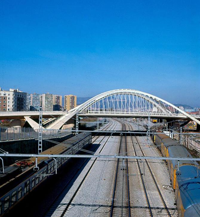 Al unir la calle de Felipe II con la calle de Bac de Roda, el puente permite el acceso directo al mar y convierte zonas marginales de la ciudad en un parque público. El puente es ahora un referente de la ciudad integrado en el paisaje urbano. Con una longitud total de 128 m, el puente se compone de tres partes: un segmento central, de 45 m de largo, sobre la vía férrea, y dos segmentos laterales, de 25 m de largo, que pasan por el parque. Las partes laterales están conectadas a las zonas verdes por cuatro escaleras, que parten de las bases de los arcos inclinados, sobre el nivel de la vía, para garantizar la continuidad visual.