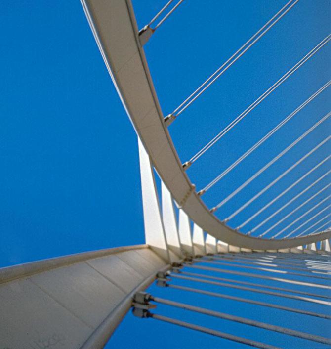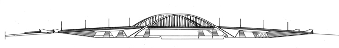 La superestructura del puente está compuesta por elementos longitudinales huecos que aguantan los carriles de circulación con vigas transversales de acero, mientras que las aceras peatonales se ensanchan, en el centro, para formar dos salientes sostenidos por los elementos estructurales y por los arcos centrales. Una viga de arco vertical, conectada a la viga del puente por medio de tirantes, caracteriza el segmento central, estabilizado por arcos laterales de acero inclinados en un ángulo de 60 grados. Este dispositivo de arcos inclinados en ángulo no solo elimina la necesidad de una armadura entre los arcos principales, sino que además permite crear un espacio público dentro de los arcos, haciendo del puente un lugar en sí mismo, en lugar de un mero conducto entre lugares.