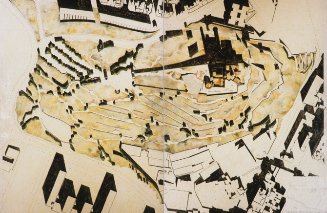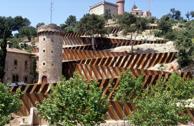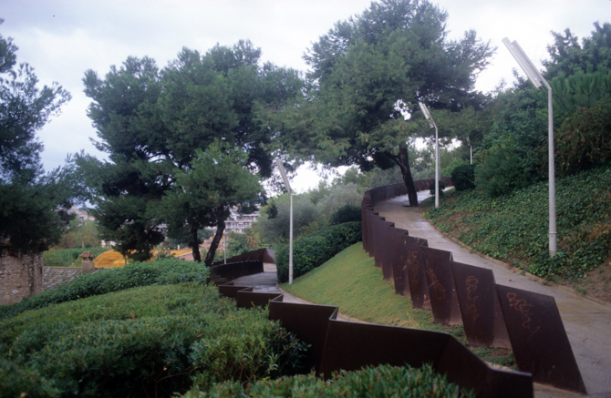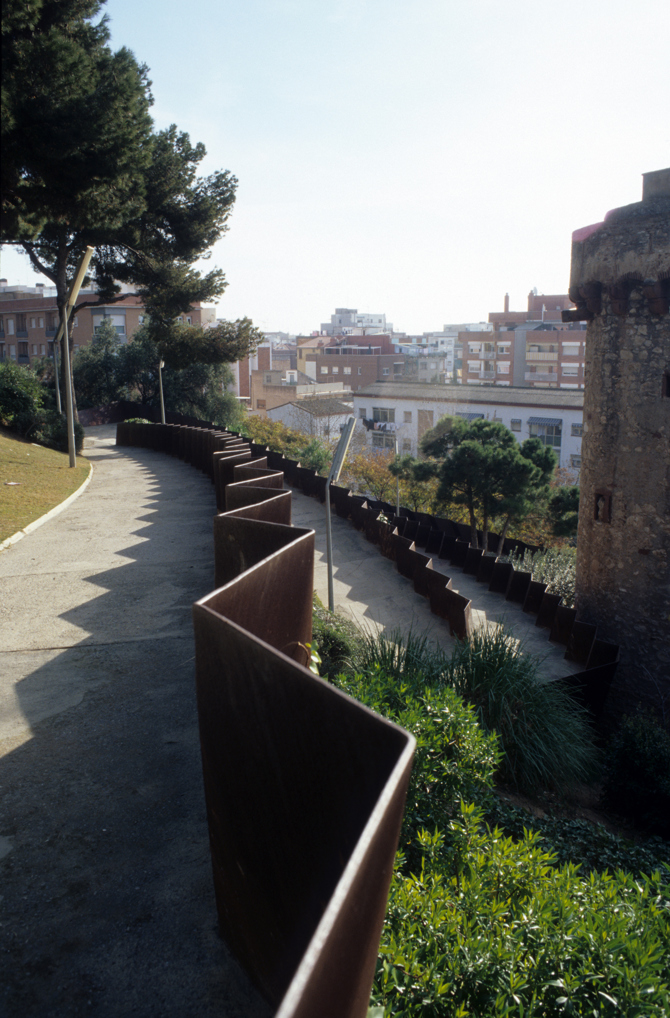 Un kilómetro de rampas para peatones asciende en curvas zigzags para conquistar el castillo desde el centro de la ciudad. Los encofrados de los muros de contención son planchas de acero corten plegadas que forman las barandillas al sobresalir del pavimento.