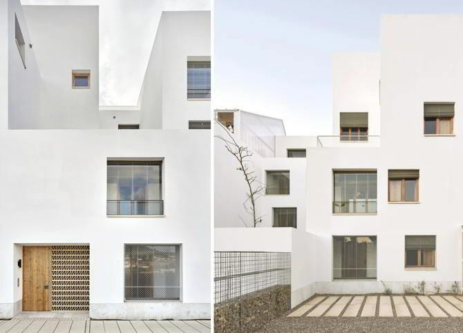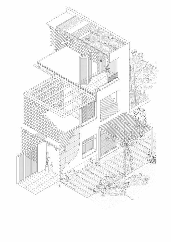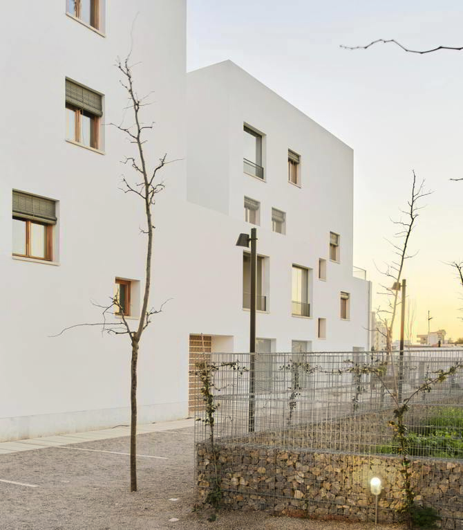 La propuesta organiza tres unidades de hasta cuatro viviendas por rellano alrededor de un patio, lo que permite ventilación cruzada en todas las tipologías. Se trata de un proyecto de alta densidad que concentra la edificación en una pieza cuya escala dialoga con los edificios circundantes, a la que se aplican retranqueos a través de discontinuidades que favorecen el uso de azoteas como terrazas. El resultado es una volumetría articulada que multiplica el número de esquinas para incrementar la velocidad del aire y mejorar la ventilación.