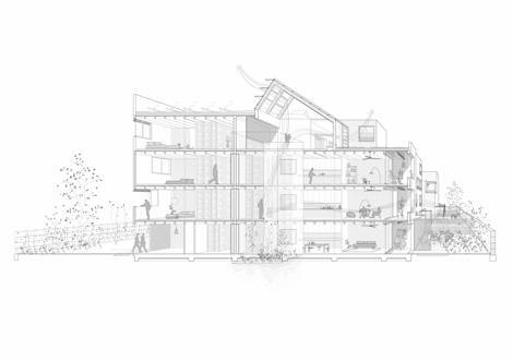 Para reducir la demanda energética se dispone una cubrición sobre el patio que funciona como atrio en invierno, cuando la inercia térmica de los muros ayuda a mantener el calor durante la noche, y como chimenea solar en verano, momento en el que se abre el atrio para permitir la disipación de calor y el incremento de la velocidad del aire, lo que mejora la sensación térmica. Para ampliar su superficie de captación, los patios se expanden en las plantas superiores como espacios comunitarios que promueven la socialización y actúan como invernaderos. Árboles, plantaciones y mobiliario urbano transforman el pasaje que vincula los tres vestíbulos en este espacio de interacción vecinal.