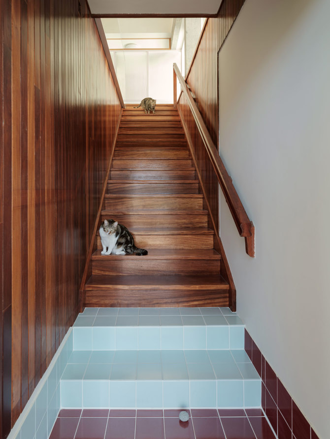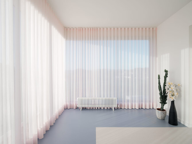 Por contra, la vivienda superior (sup. útil: 100,97 m2) se configura a partir de una sucesión de estancias de dimensiones y similares cuya posición relativa y apertura de puertas y ventanas cualifica de manera singular, creando un programa abierto a ser usado de maneras diversas. La relación con el entorno se plantea también de manera antagónica y a través de huecos convencionales que marcan las distintas visuales y que a través de contraventanas revestidas de la misma piel de fachada permite oscurecerse o abrirse contaminando al entorno de la actividad de la vivienda.