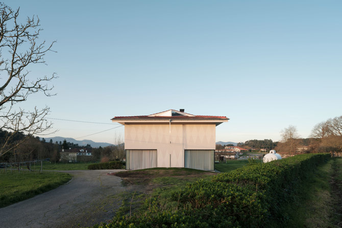 El proyecto opta así por no envolverse en entornos urbanizados que dulcifiquen su entorno, aceptando y enfatizando la posición abrupta de la casa, tirada al borde del camino, entre huertas y pastos. La imagen lejana se completa con un ejercicio compositivo en fachada que exalta el ornato. Primero, como negación de una modernidad entendida como simpleza globalizadora y segundo como una reivindicación de lo identitario, del orgullo popular y artesano de lo decorativo. A partir de aquí, se construyen dos miradas complementarias una directa en planta baja como prolongación directa y bruta del entorno y otra pausada ,controlada y furtiva que desde la planta superior permite sobrevolar el entorno y buscar el horizonte. Tras ello, el ejercicio se centra en una doble interpretación sobre la vida doméstica.