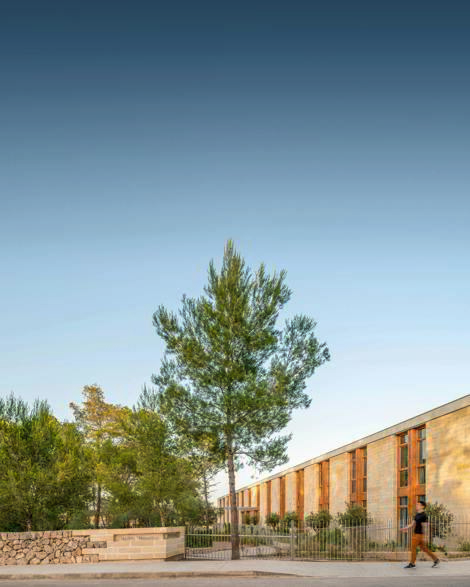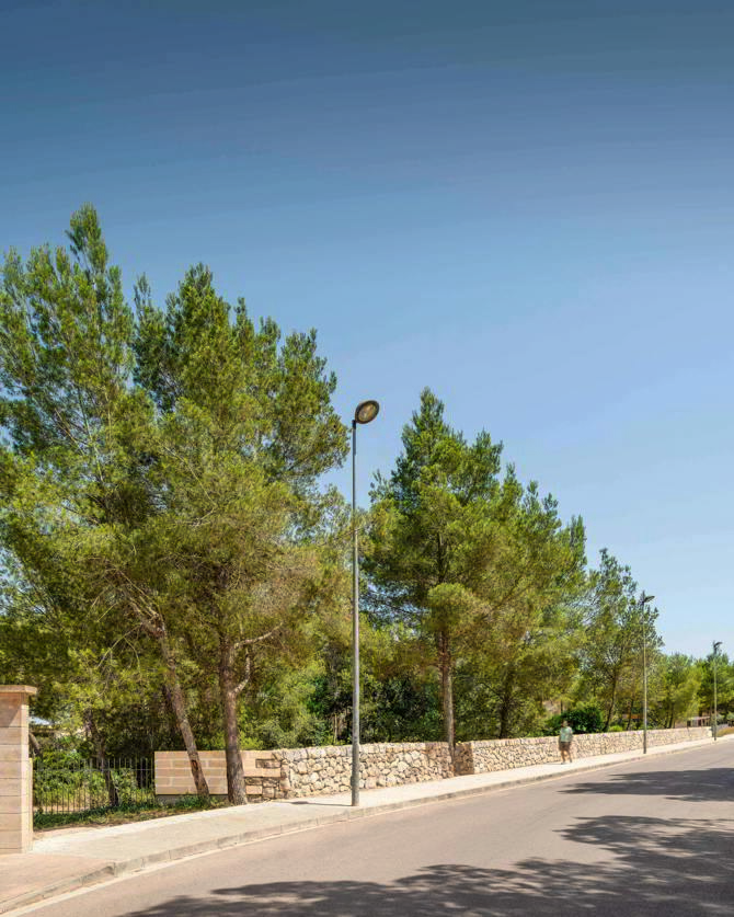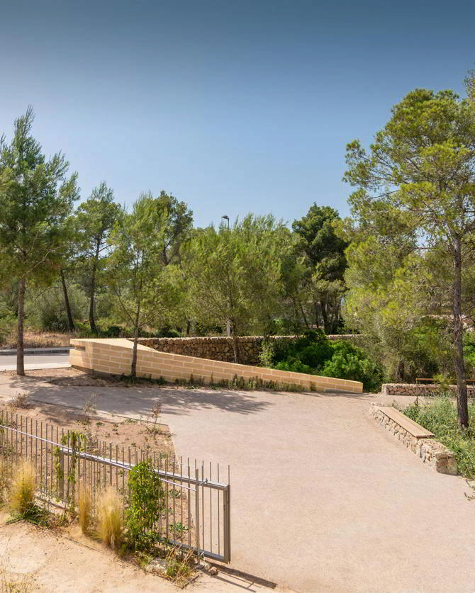 Siguiendo con esta tradición constructiva y paisajística del municipio referente al muro de piedra seca, tan característica de las Islas Baleares, el único lindero accesible desde la calle que dispone el proyecto se ha definido mediante este tipo de muro con caras a “pie de rey”. Al mismo tiempo que genera la fachada del proyecto y define en sus dos extremos las dos entradas al recinto arqueológico mediante dos hitos (fites) de marés. La entrada principal es una prolongación de la residencia geriátrica por la que accede el usuario, mientras que la secundaria es el acceso para los trabajos de mantenimiento.