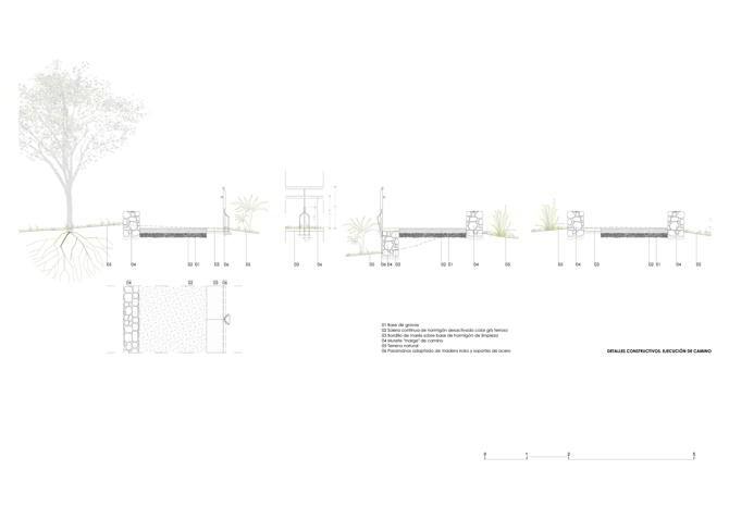 La propuesta consiste en una “promenade” sensorial y accesible, donde el usuario se envuelve de los singulares olores y colores de la vegetación mediterránea hasta llegar al mágico rincón patrimonial en el que se encuentra la cueva de marés de Son Caulelles. Esta experiencia transcurre por un recorrido adaptado que se ajusta a su accidentada e irregular topografía permitiendo a su vez superar los diferentes desniveles existentes. Además, ofrece un camino como si en la misma tierra se hubiese labrado y por ello éste se define por medio de una solera de hormigón desactivado color terroso. Al mismo tiempo y como si del mismo terreno hubieran aparecido, un bordillo de marés y un muro litoral de piedra seca (marge), muy común en los límites del entorno urbano-forestal del municipio de Marratxí, delimitan este sendero.