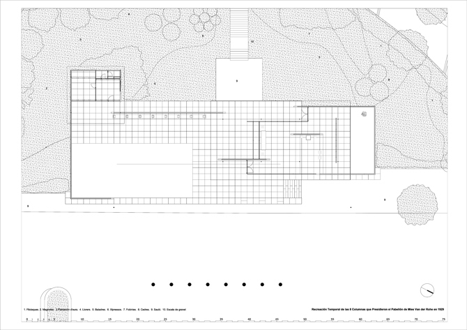Recreación temporal de las 8 columnas preexistentes frente al Pabellón de Mies Van der Rohe