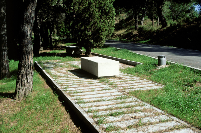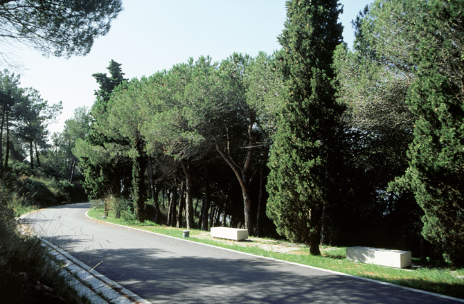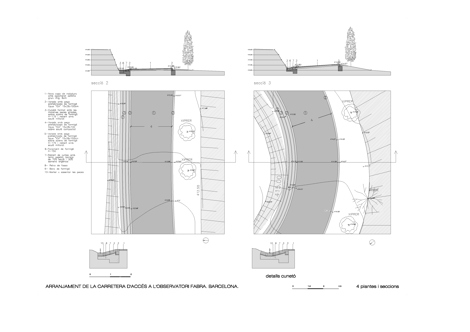 Esta disposición tumbada de las piezas se repite en unas pequeñas zonas de descanso peatonal o trabajadores del observatorio, situadas en el otro margen de la carretera. Por último, se realizó un nuevo acceso al recinto para permitir el estacionamiento y giro de los autocares, y un alumbrado de señalización a uno de los lados de la carretera.