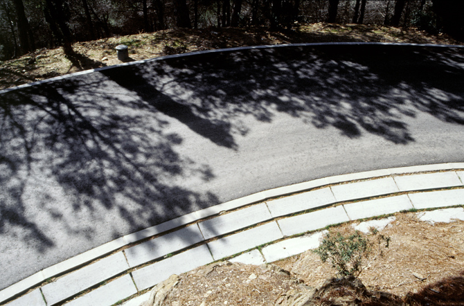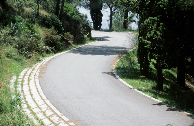 La solución trata de resolver la cuneta y el confinamiento de la calzada con una única pieza – bordillo de hormigón prefabricado de 15 x 26 x 100 cm– que disponiéndose de pie o tumbada, se vaya adaptando de la mejor manera posible al sinuoso trazado de la carretera. En el caso de la cuneta, donde la pieza se dispone tumbada, se deja una separación entre las piezas para permitir el libre crecimiento de tapizantes, variando además el número de piezas según las diferentes anchuras que van quedando hasta llegar al talud que la limita.