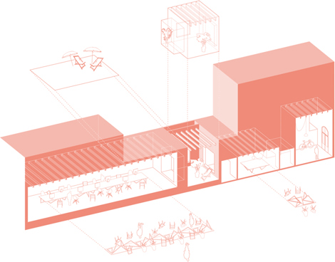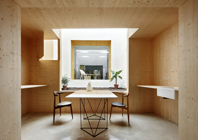 Para mejorar la iluminación interior, la propuesta se centra en la apertura de un patio con sus respectivas ventanas que se concibe como una habitación más. Esta habitación exterior divide los 40 metros de longitud en dos zonas. La zona frontal queda abierta a la calle, mientras que la posterior acoge una mesa de 12,5 metros de longitud y se destina a espacio de trabajo. En el patio se ha cuidado especialmente el espesor de las tres nuevas aberturas, recubriendo jambas, dinteles y alféizares de madera, y convirtiéndolas, de ese modo, en lugares de estancia que permiten disfrutar de ese espacio abierto, haciendo así de los umbrales espacios intermedios útiles. El resto de los espacios existentes se respetan, añadiendo apenas algunas comparticiones que refuerzan la relación sutil entre zonas habitables mediante pasos generosos y produciendo, de ese modo, una secuencia visual de espacios concatenados entre sí pero a la vez discontinuos y con entidad propia. Dada la escasez de recursos, la intervención ha decidido centrar sus esfuerzos en esos puntos singulares –el patio, los nuevos huecos, la entrada de luz, etc.- consustanciales al uso, mediante soluciones sencillas y alejadas de cualquier sofisticación tecnológica.
